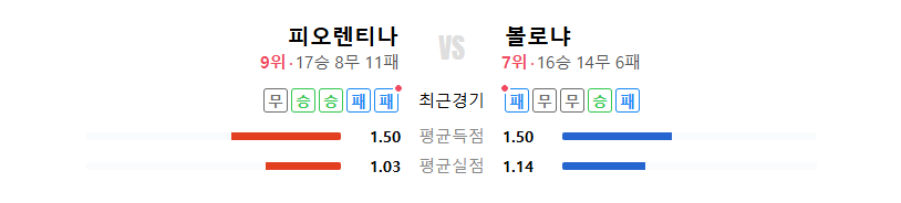 피오렌티나의 홈 이점과 볼로냐의 체력 부담을 고려할 때, 지루한 공방전 속에서 무승부 가능성이 가장 높다. |