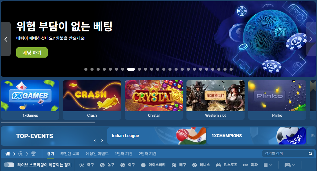 이용 가능한 게임 종류1xBet은 스포츠 베팅과 카지노 게임을 아우르는 다양한 게임을 제공합니다 - 스포츠 베팅: 축구, 크리켓, 테니스, 농구, 배구, 탁구, 권투, e스포츠(리그 오브 레전드, 도타 2, 카운터 스트라이크 등), 가상 스포츠, 카바디, 스누커, 다트 등.